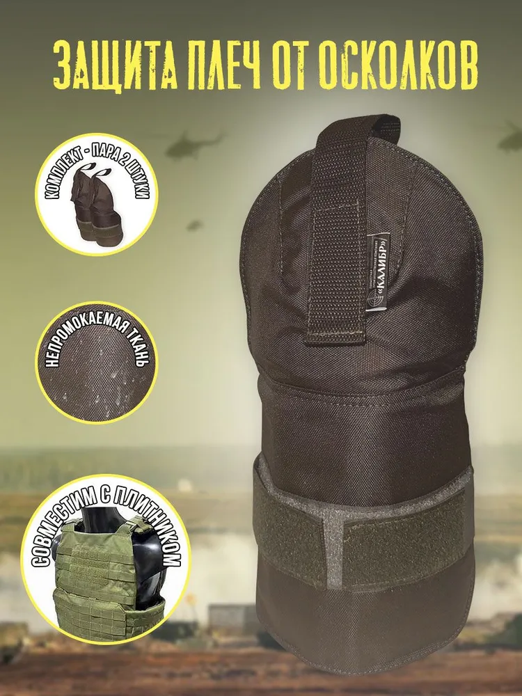 - Представленный образец защита плеч от осколков производства СПК "Калибр". Преимущество данного изделия в том, что он универсален, имеет вшитый Арамидный материал, и имеет возможность регулировки размера, что позволяет принимать форму плеча и не сковывать движения бойца, имеет стационарную баллистику.